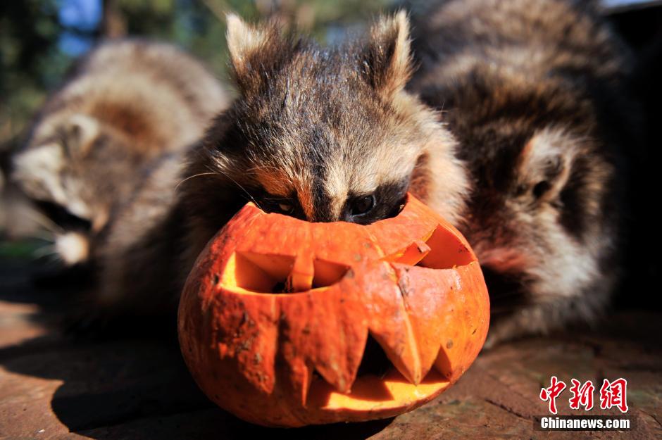 Cute coons play pumpkin lamps in Yunnan Animal Park. (CNS/Liu Ranyang)