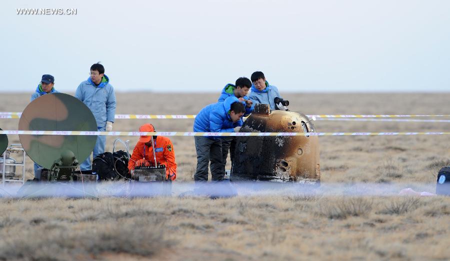 Researchers retrieve the return capsule of China's unmanned lunar orbiter in the central region of north China's Inner Mongolia Autonomous Region, Nov. 1, 2014. Return capsule of China's test lunar orbiter landed successfully early Saturday morning in north China's Inner Mongolia Autonomous Region, according to the Beijing Aerospace Control Center. (Xinhua/Zhang Ling) |