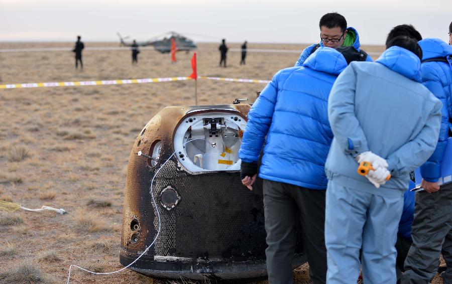 Researchers retrieve the return capsule of China's unmanned lunar orbiter in the central region of north China's Inner Mongolia Autonomous Region, Nov. 1, 2014. Return capsule of China's test lunar orbiter landed successfully early Saturday morning in north China's Inner Mongolia Autonomous Region, according to the Beijing Aerospace Control Center. (Xinhua/Ren Junchuan) |