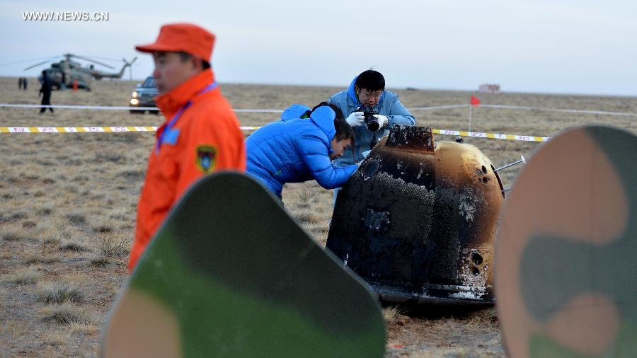 Researchers retrieve the return capsule of China's unmanned lunar orbiter in the central region of north China's Inner Mongolia Autonomous Region, Nov. 1, 2014. Return capsule of China's test lunar orbiter landed successfully early Saturday morning in north China's Inner Mongolia Autonomous Region, according to the Beijing Aerospace Control Center. (Xinhua/Ren Junchuan) |