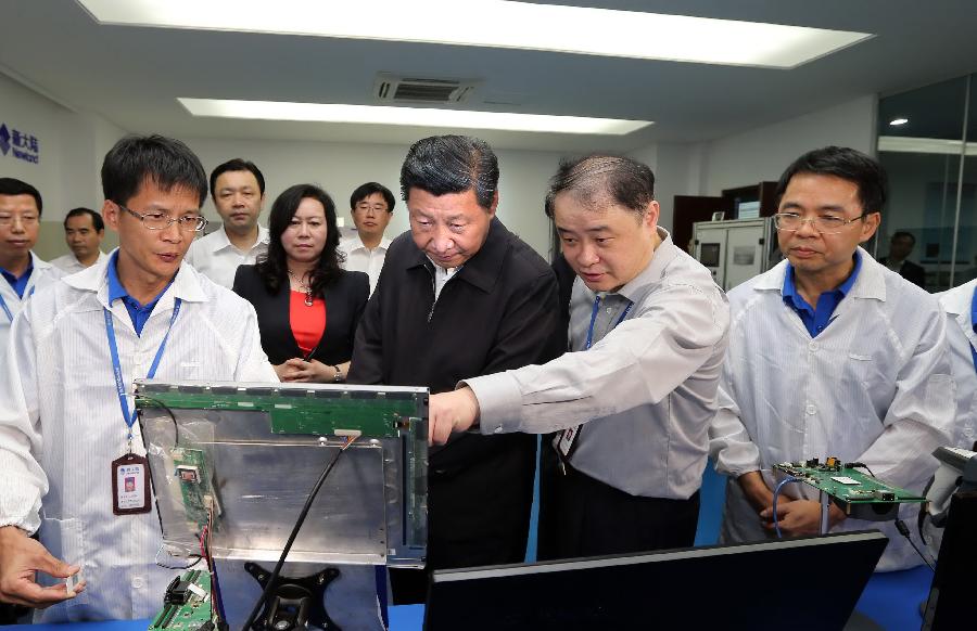 Chinese President Xi Jinping (C) visits a laboratory of the Newland Group, a high-tech company, in Fuzhou, capital of southeast China's Fujian Province, Nov. 1, 2014. Xi made an inspection tour to southeast China's Fujian Province on Nov. 1 and 2. (Xinhua/Lan Hongguang) |