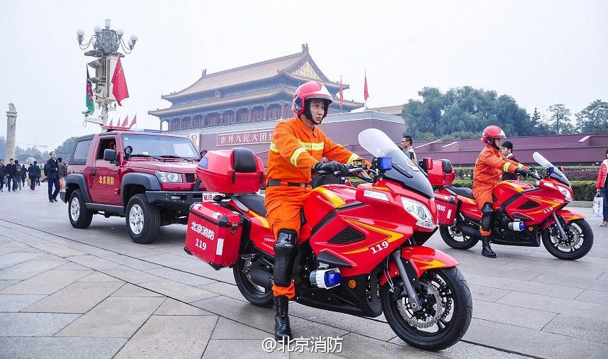 Police officers demonstrate the new-type fire motorcycles on a street of Beijing on Sunday, October 2, 2014. With a maximum speed of 117km/h, these fire motorcycles are introduced for the upcoming APEC meeting. [Photo/ Weibo account of Beijing Public Security Bureau] |