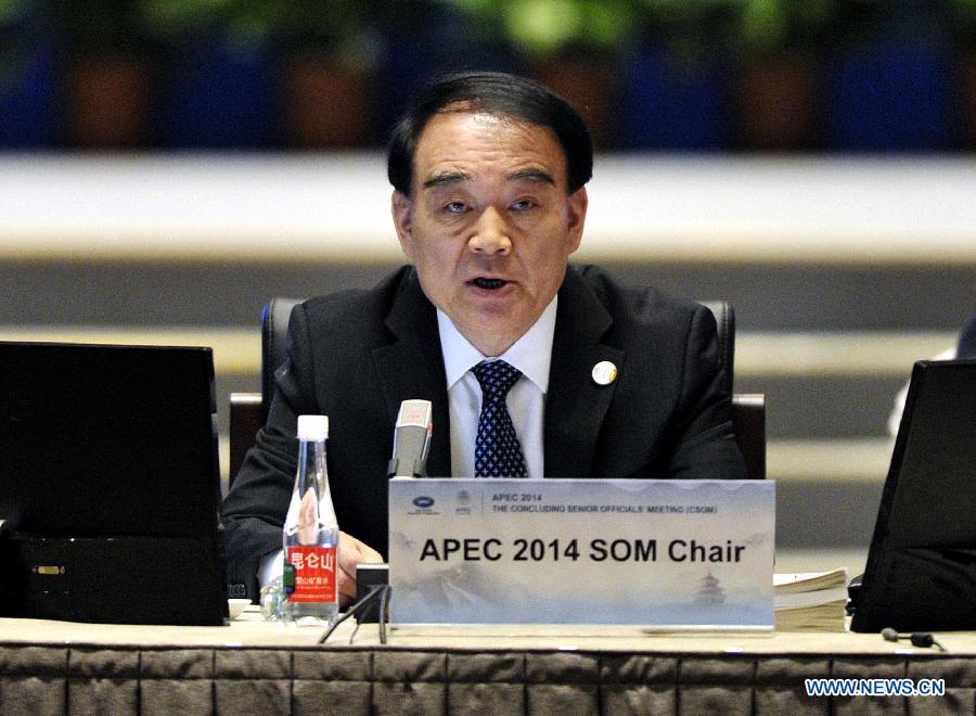 Chinese deputy Foreign Minister Li Baodong, also Chair of the Asia-Pacific Economic Cooperation (APEC) 2014 Senior Officials Meeting (SOM), speaks during the Concluding SOM at China National Convention Center in Beijing, capital of China, Nov. 5, 2014. The APEC 2014 CSOM will be held here from Nov. 5 to 6. (Xinhua/Ma Ning) |