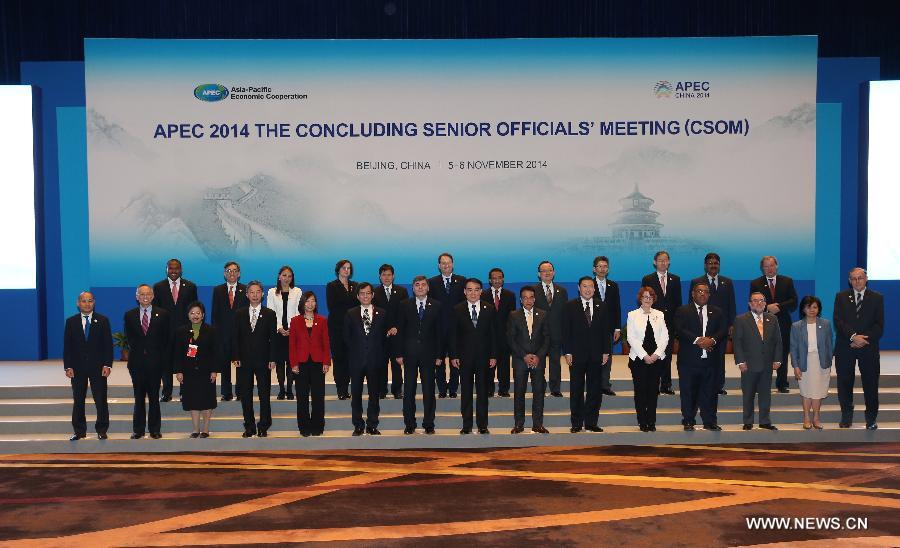 Officials attending the Asia-Pacific Economic Cooperation (APEC) 2014 Concluding Senior Officials Meeting (CSOM) pose for a group picture at China National Convention Center in Beijing, capital of China, Nov. 5, 2014. The APEC 2014 CSOM is held here from Nov. 5 to 6. (Xinhua/Jin Liwang) |