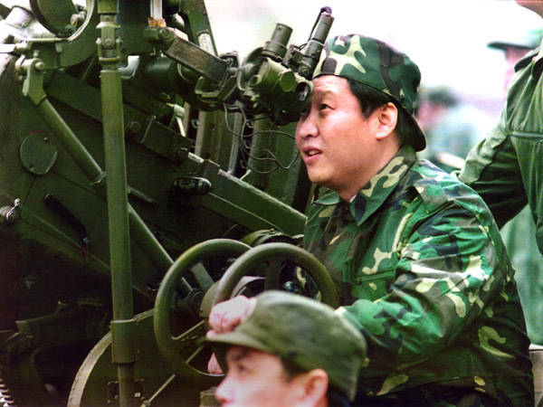 Photo taken in Nov. 1997 shows Xi Jinping, then Deputy Party Secretary of Fujian and First Political Commissar of Fujian Reserve Artillery Division (former Fujian Reserve Infantry Division), tries his hand during a gun crew training. (Photo source: PLA Pictorial) |