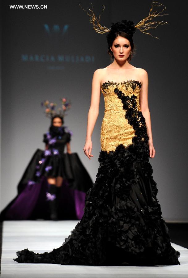 A model presents a creation by Indonesian designer Dominique Nadine during the Jakarta Fashion Week 2015 in Jakarta, Indonesia, Nov. 5, 2014. (Xinhua/Agung Kuncahya B.)