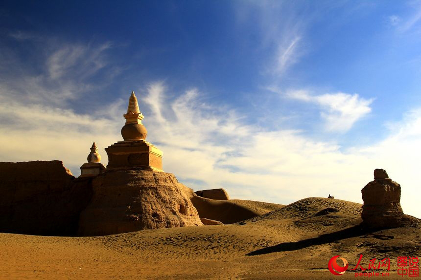 Heicheng city relic is located in Ejin Banner, north China’s Inner Mongolia Autonomous Region. It is the biggest and best-preserved ancient city relic along the Silk Road. The landmark building of the city is a 13-meter-high pagoda. Although part of the city has been covered by the sand, the city layout is still neat. (Photo source: people.cn) |