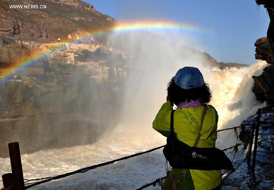 A tourist takes photo of a rainbow at the Hukou Waterfall in Linfen, north China's Shanxi province, Nov 6, 2014. (Xinhua/Lyu Guiming)