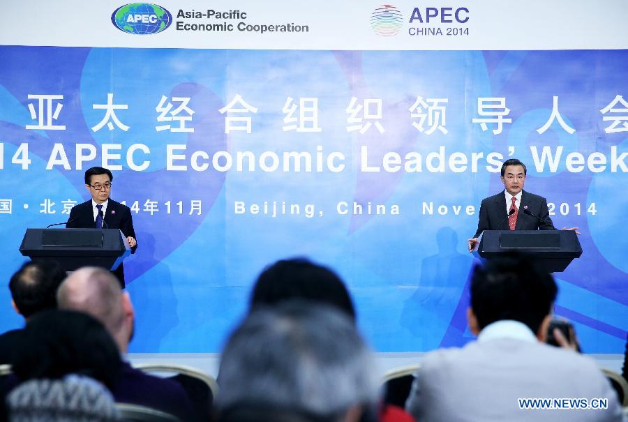 Chinese Foreign Minister Wang Yi (R) and Minister of Commerce Gao Hucheng hold a press conference after the 26th APEC Ministerial Meeting at the China National Convention Center in Beijing, China, Nov. 8, 2014. (Xinhua/Wang Shen)