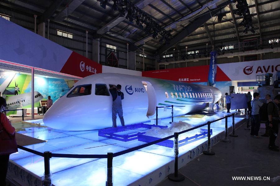 A model of Xinzhou-700 aircraft of the Aviation Industry Corporation of China (AVIC) is seen ahead of the 10th China International Aviation and Aerospace Exhibition in Zhuhai, south China's Guangdong Province, Nov. 8, 2014. Some 700 exhibitors at home and abroad with 130-plus planes will attend the six-day airshow from November 11 to 16. (Xinhua/Pang Jie) |