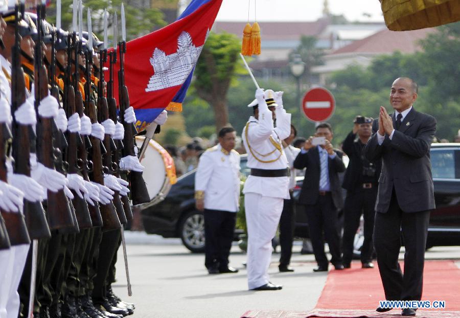 Cambodian King Norodom Sihamoni (R) inspects the guards of honor during the celebration of the Independence Day in Phnom Penh, Cambodia, Nov. 9, 2014. Cambodia marked the 61st anniversary of the declaration of the Independence Day from French protectorate on Sunday. (Xinhua/Sovannara)