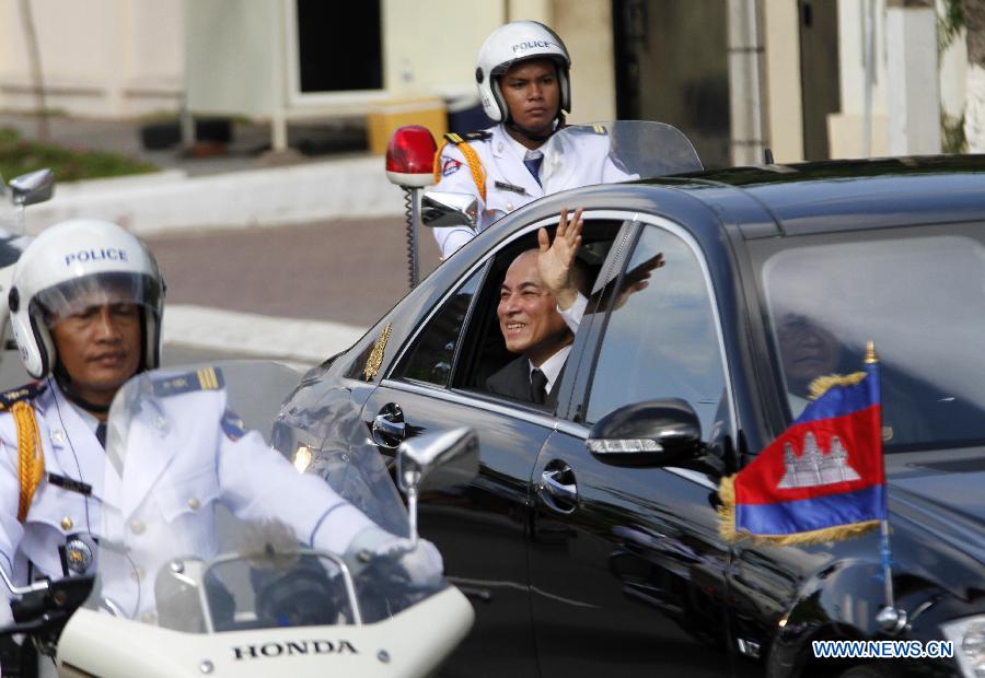 Cambodian King Norodom Sihamoni gestures from his car during the celebration of the Independence Day in Phnom Penh, Cambodia, Nov. 9, 2014. Cambodia marked the 61st anniversary of the declaration of the Independence Day from French protectorate on Sunday. (Xinhua/Sovannara)