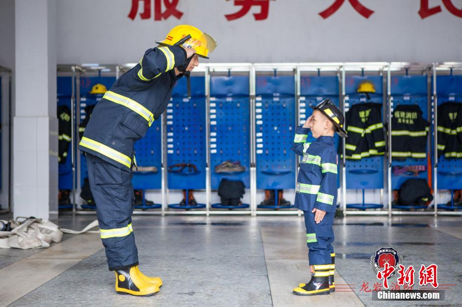 This group of photos is a birthday gift from the firefighters of Longyan Fire Department to Zhuang Yuming, who is a little fan of firefighters. In order to help Zhuang realize his dream, the firefighters decided to give him this special birthday present by making him mini firefighter uniform, and arranging a photo shoot with them in the fire department.