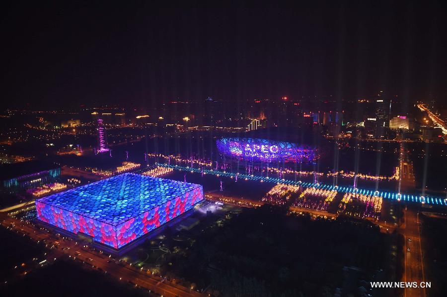 Photo taken on Nov. 10, 2014 shows the night view of the National Gymnasium (the "Bird Nest") and the National Aquatics Center (the "Water Cube") and their surroundings ahead of the 22nd Asia-Pacific Economic Cooperation (APEC) Economic Leaders' Meeting in Beijing, capital of China. The 22nd APEC Economic Leaders' Meeting is held in Beijing from Nov. 10 to 11. (Xinhua/Chen Yehua) |