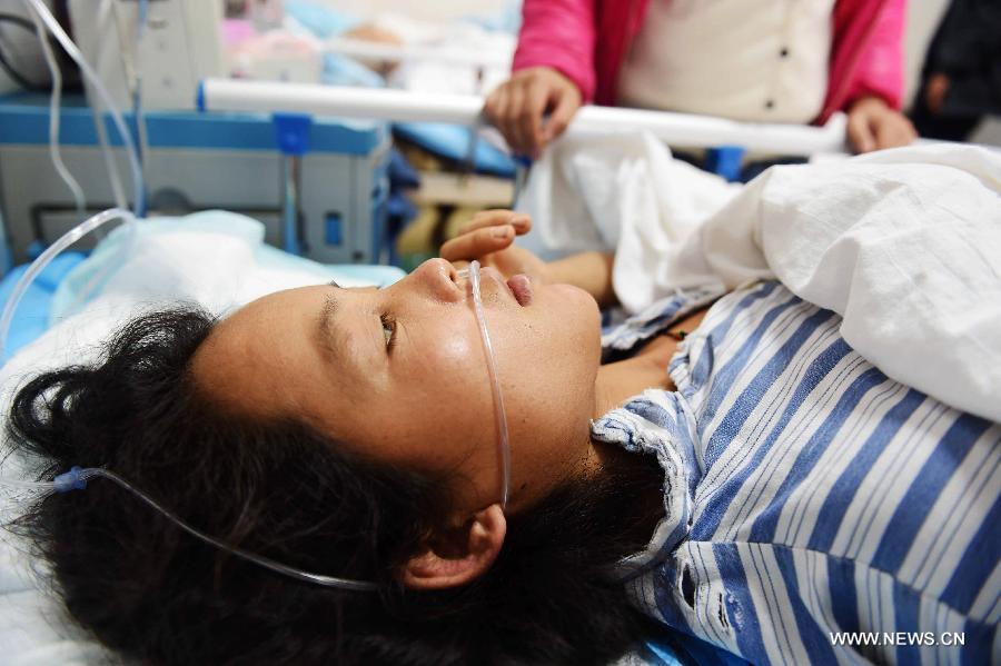 An injured woman receives treatment at the Renmin Hospital in Du'an Yao Autonomous County, south China's Guangxi Zhuang Autonomous Region, Nov. 10, 2014. Nine people were killed and five others injured when the overloaded vehicle drove off a cliff here on Nov. 9. (Xinhua/Zhang Ailin) |