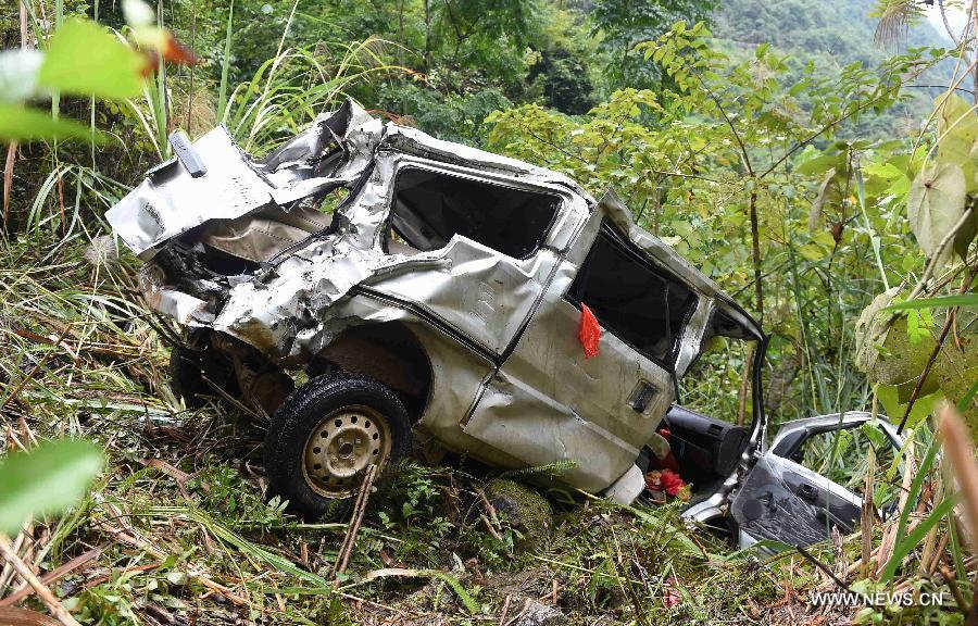 A damaged vehicle is seen at the road accident site in Du'an Yao Autonomous County, south China's Guangxi Zhuang Autonomous Region, Nov. 10, 2014. Nine people were killed and five others injured when the overloaded vehicle drove off a cliff here on Nov. 9. (Xinhua/Zhang Ailin) |