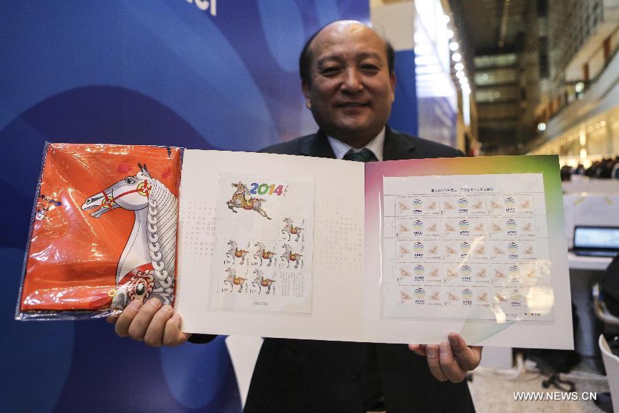 A working staff member shows the commemorative stamps album for the 22nd Asia-Pacific Economic Cooperation (APEC) Economic Leaders' Meeting at the China National Convention Center in Beijing, capital of China, Nov. 9, 2014. The first-day cover and commemorative stamps for the 22nd APEC Economic Leaders' Meeting are released here Sunday. (Xinhua/Zhang Yuwei) |