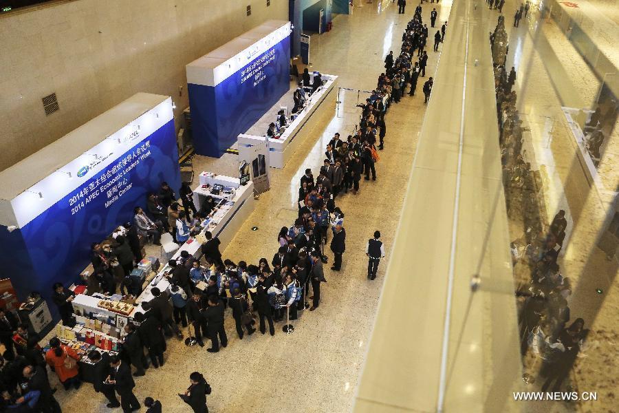 People wait to buy the first-day cover and commemorative stamps for the 22nd Asia-Pacific Economic Cooperation (APEC) Economic Leaders' Meeting at the China National Convention Center in Beijing, capital of China, Nov. 9, 2014. The first-day cover and commemorative stamps for the 22nd APEC Economic Leaders' Meeting are released here Sunday. (Xinhua/Zhang Yuwei) |