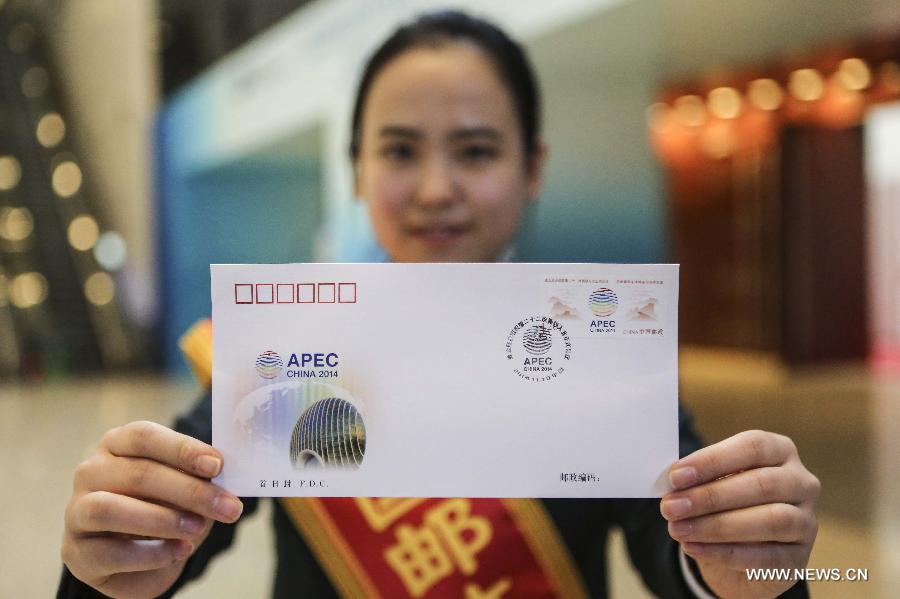 A working staff member shows the first-day cover for the 22nd Asia-Pacific Economic Cooperation (APEC) Economic Leaders' Meeting at the China National Convention Center in Beijing, capital of China, Nov. 9, 2014. The first-day cover and commemorative stamps for the 22nd APEC Economic Leaders' Meeting are released here Sunday. (Xinhua/Zhang Yuwei) |