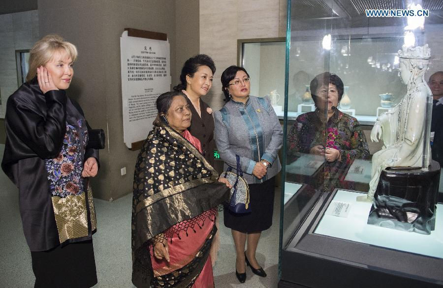 Chinese President Xi Jinping's wife Peng Liyuan and guests watch a porcelain at the Capital Museum in Beijing, capital of China, Nov. 9, 2014. Peng invited wives of Bangladesh President Abdul Hamid, Mongolian President Tsakhiagiin Elbegdorj and Shanghai Cooperation Organization Secretary-General Dmitry Mezentsev to the Capital Museum on Sunday. (Xinhua/Huang Jingwen)