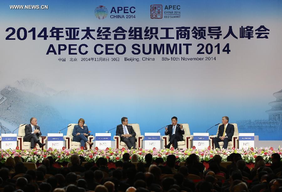 Dennis Nally, Global Chairman of PricewaterhouseCoopers International Ltd., Chilean President Michelle Bachelet, World Trade Organization (WTO) Director-General Roberto Azevedo, Frank Ning, Chairman of COFCO Corporation & APEC Business Advisory Council Chair 2014, and Caterpillar Chairman and CEO Douglas Oberhelman (L - R) attend a summit dialogue on Asia-Pacific economic integration and global multilateral trade system during the 2014 Asia-Pacific Economic Cooperation (APEC) CEO Summit in Beijing, capital of China, Nov. 9, 2014. The 2014 APEC CEO Summit opened in Beijing on Sunday. (Xinhua/Yin Gang) |
