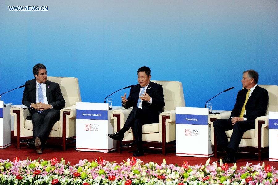 Frank Ning (C), Chairman of COFCO Corporation & APEC Business Advisory Council Chair 2014, speaks in a summit dialogue on Asia-Pacific economic integration and global multilateral trade system during the 2014 Asia-Pacific Economic Cooperation (APEC) CEO Summit in Beijing, capital of China, Nov. 9, 2014. The 2014 APEC CEO Summit opened in Beijing on Sunday. (Xinhua/Luo Xiaoguang) |