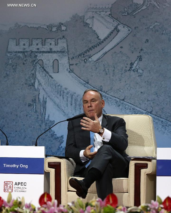 Dennis Nally, Global Chairman of PricewaterhouseCoopers International Ltd., attends a summit dialogue on Asia-Pacific economic integration and global multilateral trade system during the 2014 Asia-Pacific Economic Cooperation (APEC) CEO Summit in Beijing, capital of China, Nov. 9, 2014. The 2014 APEC CEO Summit opened in Beijing on Sunday. (Xinhua/Yin Gang) |