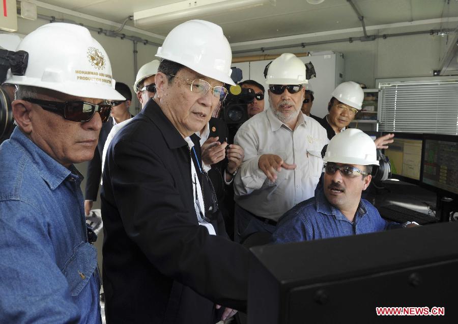 Yu Zhengsheng (C, front), chairman of the National Committee of Chinese People's Political Consultative Conference (CPPCC), inquires about the production of potash on a mining ship during his visit to the Arab Potash Company (APC) in Amman, Jordan, Nov. 8, 2014. (Xinhua/Zhang Duo) |