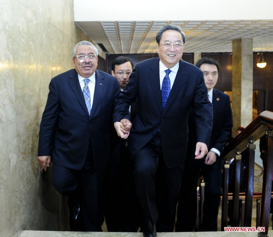 Yu Zhengsheng (R, front), chairman of the National Committee of Chinese People's Political Consultative Conference (CPPCC), walks into the venue hand in hand with the President of the Jordanian Senate Abdul Raouf Rawabdeh (L, front) before their talks in Amman, Jordan, Nov. 9, 2014. Yu Zhengsheng held talks with Abdul Raouf Rawabdeh here on Sunday. (Xinhua/Zhang Duo) |