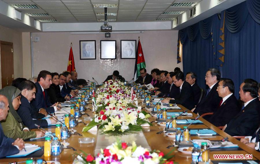 Yu Zhengsheng (3rd R), chairman of the National Committee of Chinese People's Political Consultative Conference (CPPCC), meets with Jordan's Acting House Speaker Ahmad Safadi in Amman, Jordan, Nov. 9, 2014. (Xinhua/Liu Weibing)