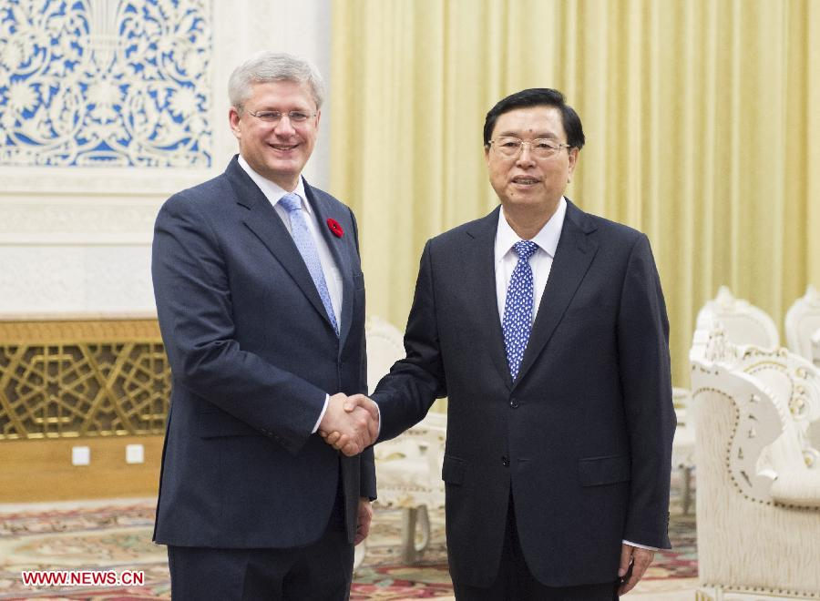 Zhang Dejiang (R), chairman of the Standing Committee of the National People's Congress of China, meets with Canadian Prime Minister Stephen Harper at the Great Hall of the People in Beijing, capital of China, Nov. 9, 2014. (Xinhua/Xie Huanchi)