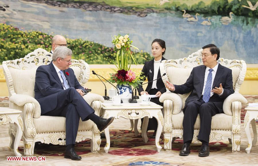 Zhang Dejiang (R), chairman of the Standing Committee of the National People's Congress of China, meets with Canadian Prime Minister Stephen Harper at the Great Hall of the People in Beijing, capital of China, Nov. 9, 2014. (Xinhua/Xie Huanchi) |