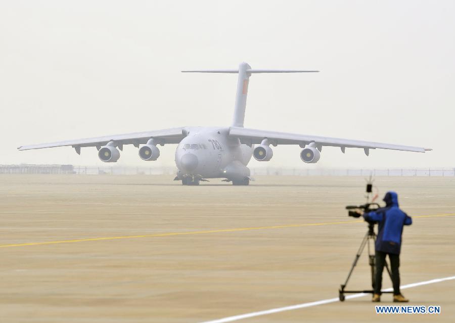 China's Y-20 military transport aircraft performs at the 10th China International Aviation and Aerospace Exhibition in Zhuhai, south China's Guangdong Province, Nov. 11, 2014. Some 700 exhibitors at home and abroad with 130-plus planes attended the airshow from Nov. 11 to 16. (Xinhua/Liang Xu) |