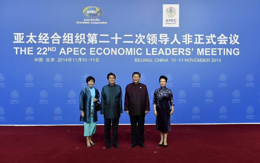 Chinese President Xi Jinping (2nd R), his wife Peng Liyuan (R), Japanese Prime Minister Shinzo Abe (2nd L) and his wife Akie Abe pose for photo before a welcome banquet for the 22nd Asia-Pacific Economic Cooperation (APEC) Economic Leaders' Meeting in B?eijing, capital of China, Nov. 10, 2014. (Xinhua/Xie Huanchi) |