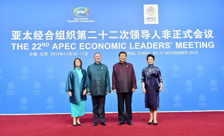 Chinese President Xi Jinping (2nd R), his wife Peng Liyuan (R), New Zealand's Prime Minister John Key (2nd L) and his wife Bronagh Key pose for photo before a welcome banquet for the 22nd Asia-Pacific Economic Cooperation (APEC) Economic Leaders' Meeting in B?eijing, capital of China, Nov. 10, 2014. (Xinhua/Li Tao) |