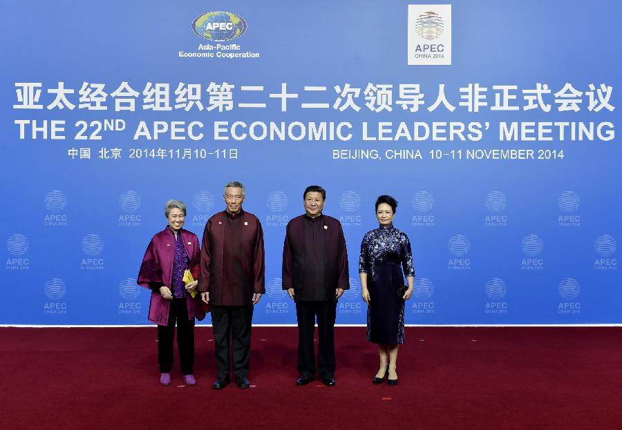 Chinese President Xi Jinping (2nd R) and his wife Peng Liyuan (R) pose for photo with Singaporean Prime Minister Lee Hsien Loong (2nd L) and his wife Ho Ching before a welcome banquet for the 22nd Asia-Pacific Economic Cooperation (APEC) Economic Leaders' Meeting in Beijing, China, Nov. 10, 2014. (Xinhua/Xie Huanchi) |