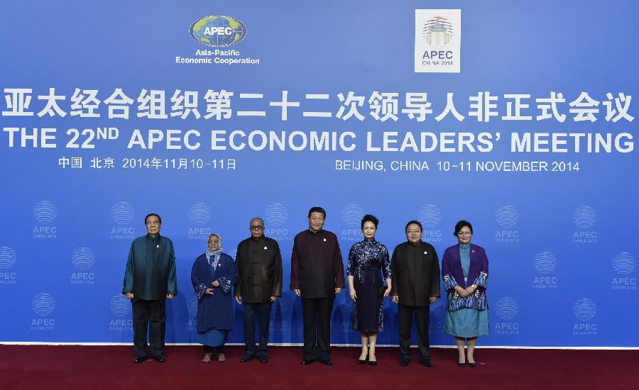 Chinese President Xi Jinping (C) and his wife Peng Liyuan (3rd R) pose for photos with Lao President Choummaly Sayasone (1st L), Bangladeshi President Abdul Hamid (3rd L), his wife Rashida (2nd L), Mongolian President Tsakhiagiin Elbegdorj (2nd R) and his wife Khajidsuren Bolormaa, who have been in China for a dialogue meeting on strengthening connectivity and improving cooperation, before a welcome banquet for the 22nd APEC Economic Leaders' Meeting in Beijing, capital of China, Nov. 10, 2014. (Xinhua/Xie Huanchi) |