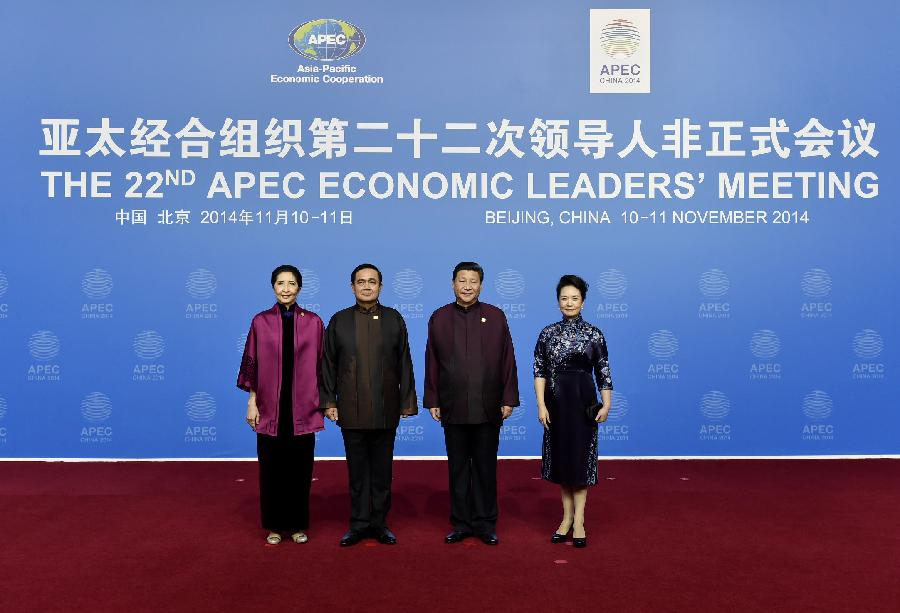 Chinese President Xi Jinping (2nd R) and his wife Peng Liyuan (1st R) pose for a photo with Thai Prime Minister Prayuth Chan-ocha (2nd L) and his wife Naraporn Chan-ocha before a welcome banquet for the 22nd Asia-Pacific Economic Cooperation (APEC) Economic Leaders' Meeting in Beijing, China, Nov. 10, 2014. (Xinhua/Xie Huanchi) |