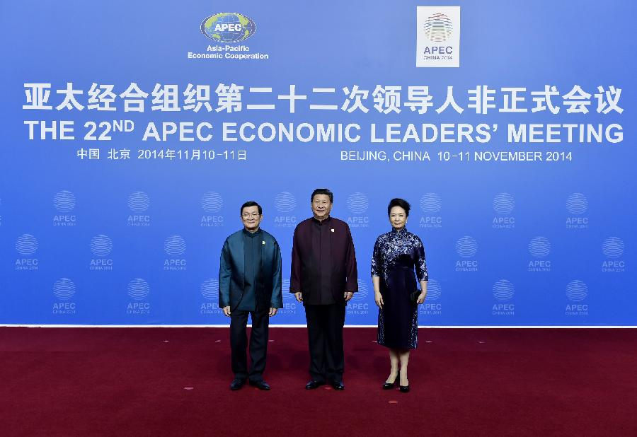 Chinese President Xi Jinping (C) and his wife Peng Liyuan (R) pose for photo with Vietnam's President Truong Tan Sang before a welcome banquet for the 22nd Asia-Pacific Economic Cooperation (APEC) Economic Leaders' Meeting in Beijing, China, Nov. 10, 2014. (Xinhua/Xie Huanchi) |