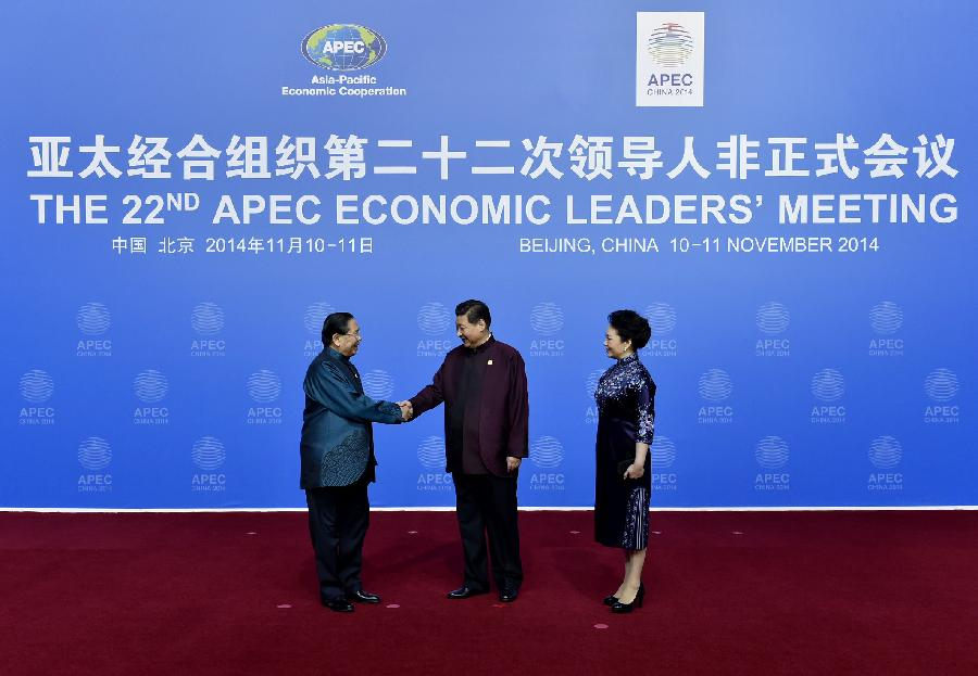 Chinese President Xi Jinping (C) and his wife Peng Liyuan (R) welcome Lao President Choummaly Sayasone before a welcome banquet for the 22nd Asia-Pacific Economic Cooperation (APEC) Economic Leaders' Meeting in Beijing, China, Nov. 10, 2014. (Xinhua/Xie Huanchi) |