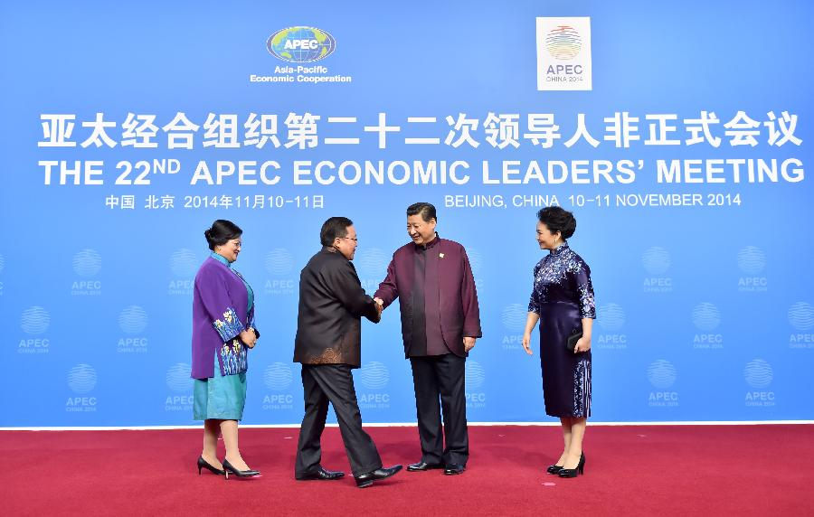 Chinese President Xi Jinping (2nd R), his wife Peng Liyuan (R), Mongolian President Tsakhiagiin Elbegdorj (2nd L) and his wife Khajidsuren Bolormaa prepare to pose for photos before a welcome banquet for the 22nd Asia-Pacific Economic Cooperation (APEC) Economic Leaders' Meeting in B?eijing, capital of China, Nov. 10, 2014. (Xinhua/Li Tao) |