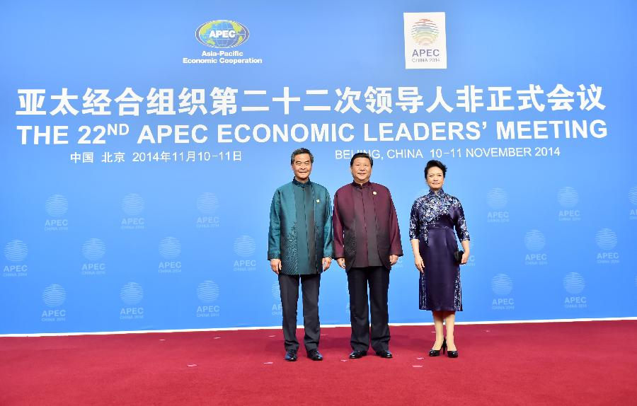 Chinese President Xi Jinping (C), his wife Peng Liyuan (R) and Chief Executive of China's Hong Kong SAR Leung Chun-ying pose for a photo before a welcome banquet for the 22nd Asia-Pacific Economic Cooperation (APEC) Economic Leaders' Meeting in B?eijing, capital of China, Nov. 10, 2014. (Xinhua/Li Tao) |