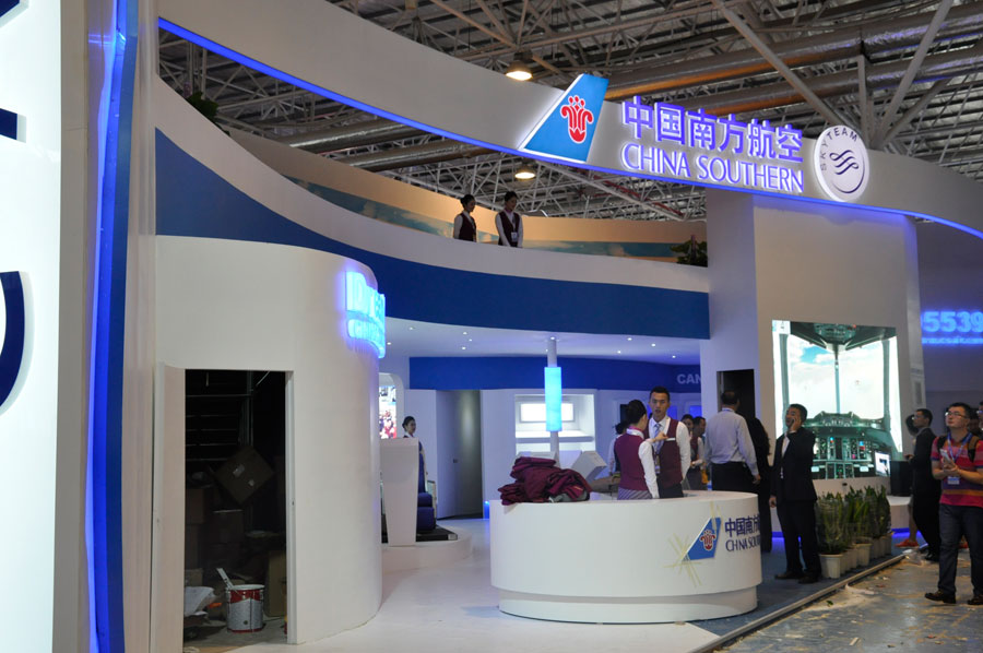 Photo taken on Nov. 10, 2014 shows exhibitors getting ready for the 10th China International Aviation & Aerospace Exhibition (Airshow China 2014) scheduled from Nov. 11 to 16 in Zhuhai, south China’s Guangdong province. (People’s Daily Online/ Sun Zhao)