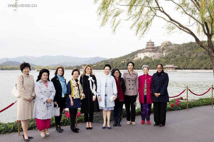 Peng Liyuan (6th L), wife of Chinese President Xi Jinping, poses for photo with Akie Abe (L), wife of Japanese prime minister Shinzo Abe, Rosmah Mansor (2nd L), wife of Malaysia's Prime Minister Najib Razak, Bronagh Key (3rd L), wife of New Zealand's Prime Minister John Key, Susan Chu (4th L), wife of Honorary Chairman of Taiwan-based Cross-Straits Common Market Foundation Vincent Siew, Angelica Rivera Hurtado (5th L), wife of Mexican President Enrique Pena Nieto, Iriana Widodo (4th R), wife of Indonesian President Joko Widodo, Naraporn Chan-ocha (3rd R), wife of Thailand's Prime Minister Prayuth Chan-ocha, Ho Ching (2nd R), wife of Singapore's Prime Minister Lee Hsien Loong, and Lynda Babao (R), wife of Papua New Guinea Prime Minister Peter O'Neill, during a visit to the Summer Palace in Beijing, China, Nov. 11, 2014. Peng invited the wives of some leaders and representatives from the Asia-Pacific Economic Cooperation (APEC) member economies to visit the Summer Palace on Tuesday. (Xinhua/Huang Jingwen) |