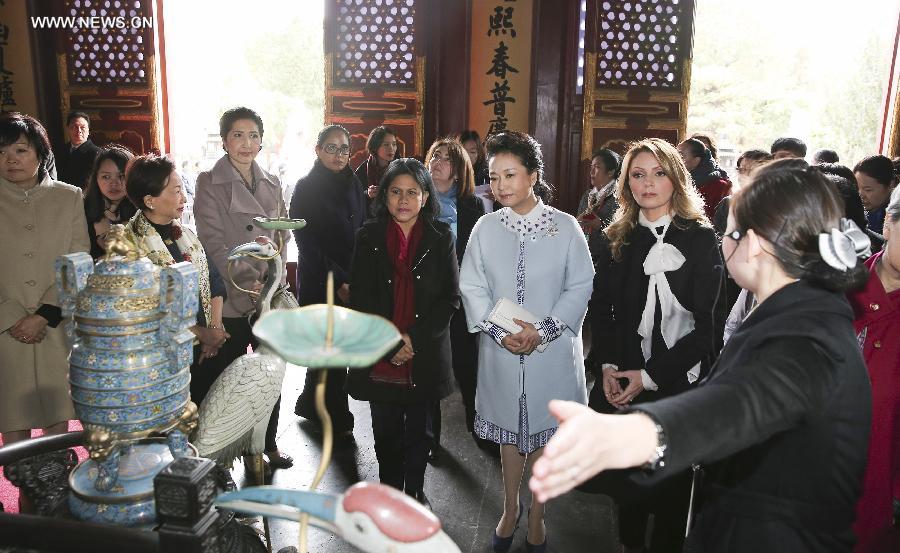 Peng Liyuan (C), wife of Chinese President Xi Jinping, accompanies the wives of some leaders and representatives from the Asia-Pacific Economic Cooperation (APEC) member economies during a visit to Renshou (Benevolence and Longevity) Hall of the Summer Palace in Beijing, China, Nov. 11, 2014. (Xinhua/Ding Lin) |