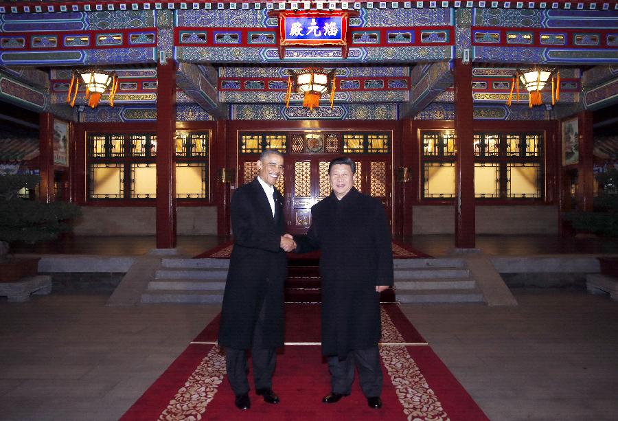 Chinese President Xi Jinping (R) and his U.S. counterpart Barack Obama shake hands at the Zhongnanhai leadership compound in Beijing, capital of China, Nov. 11, 2014. Xi Jinping held a bilateral meeting with visiting U.S. President Barack Obama in Beijing Tuesday evening. (Xinhua/Ju Peng) |