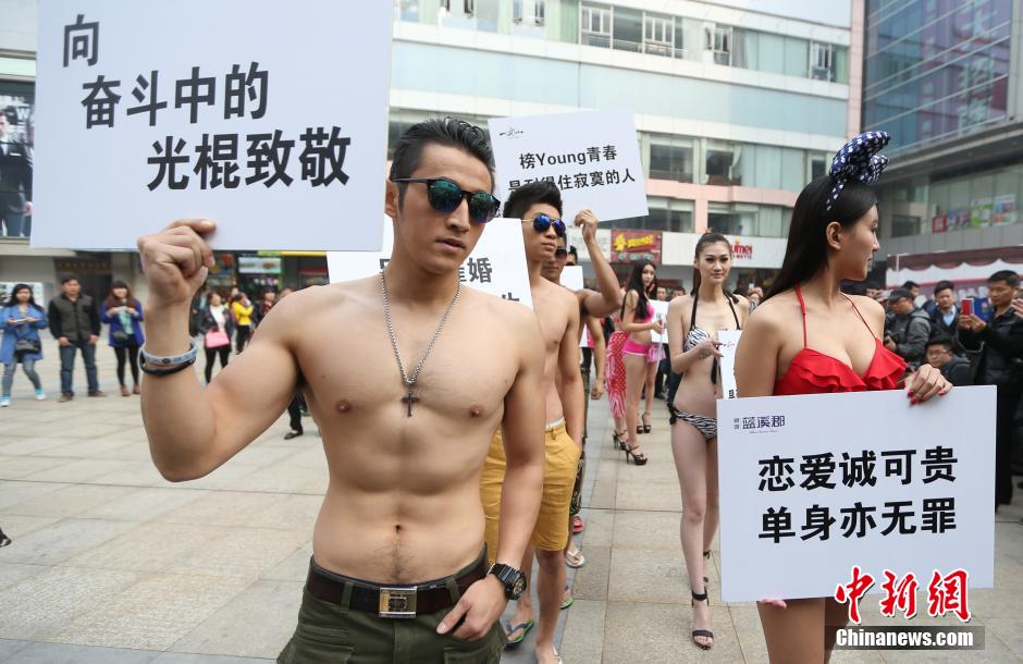 Placards reading "Although relationships are good, no one has the right to blame on singles", "Only you can decide your life" and "Pay tribute to singles" held by young people wearing summer clothes attract enormous attention in Nanjing, east China's Jiangsu province on Nov. 11, 2014. (CNS/Yang Bo)