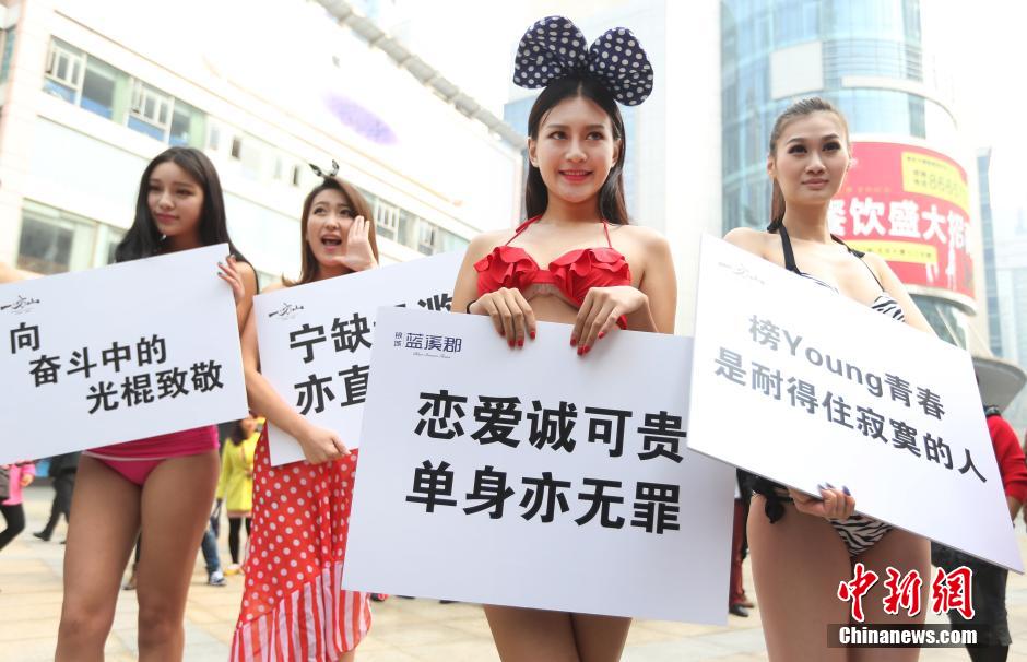 Placards reading "Although relationships are good, no one has the right to blame on singles", "Only you can decide your life" and "Pay tribute to singles" held by young people wearing summer clothes attract enormous attention in Nanjing, east China's Jiangsu province on Nov. 11, 2014. (CNS/Yang Bo)