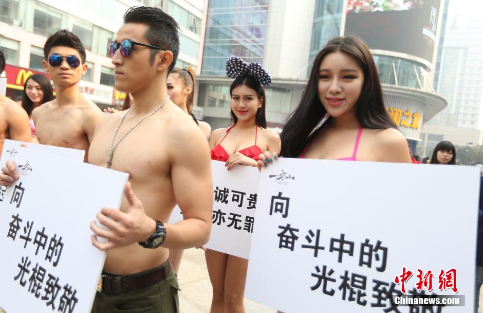 Placards reading "Although relationships are good, no one has the right to blame on singles", "Only you can decide your life" and "Pay tribute to singles" held by young people wearing summer clothes attract enormous attention in Nanjing, east China's Jiangsu province on Nov. 11, 2014. (CNS/Yang Bo) |