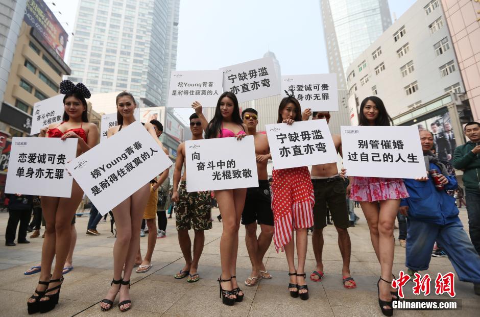 Placards reading "Although relationships are good, no one has the right to blame on singles", "Only you can decide your life" and "Pay tribute to singles" held by young people wearing summer clothes attract enormous attention in Nanjing, east China's Jiangsu province on Nov. 11, 2014. (CNS/Yang Bo) |